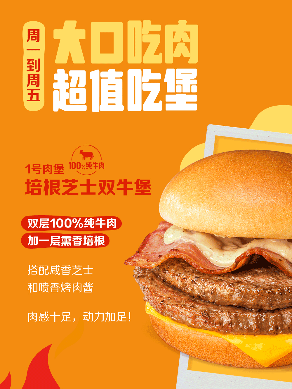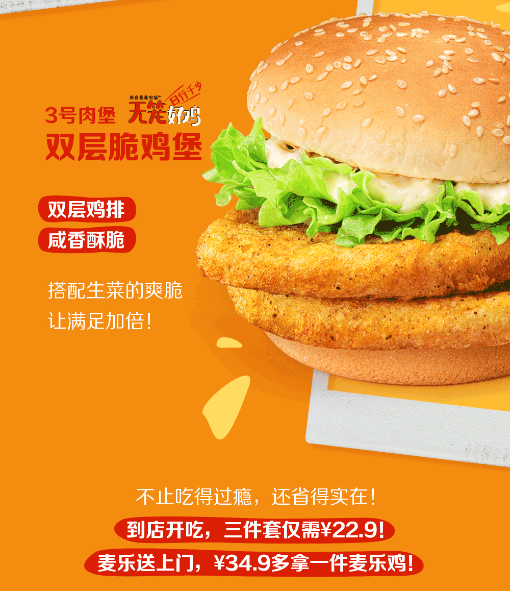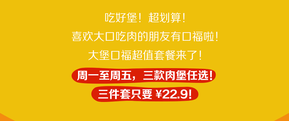 *大堡口福三件套仅需¥22.9是指飞碟鸡排堡、双层脆鸡堡、培根芝士双牛堡任意一款汉堡搭配薯条(中)和中可口可乐(1杯)为22.9元。食品及包装以实物为准,图片仅供参考。上述产品自2024年8月26日起至2024年10月7日,仅在全国部分餐厅适用(不含港澳台地区餐厅,不含交通枢纽、服务区、旅游景区等特殊餐厅),具体以店内公示为准。活动渠道:仅限麦当劳App及麦当劳微信/支付宝小程序的到店取餐渠道、自助点餐机、餐厅柜台。以上组合仅限周一至周五早餐时段后供应,早餐供应时间以餐厅实际为准,至上午10:30结束。通过麦乐送送餐服务、第三方外送平台、电商平台等渠道点餐的,优惠活动参与情况以各自渠道的图示宣传为准。除推广产品外,其他物品不在售卖范围。不与其他优惠同享。“Coca-Cola”是可口可乐公司的商标。