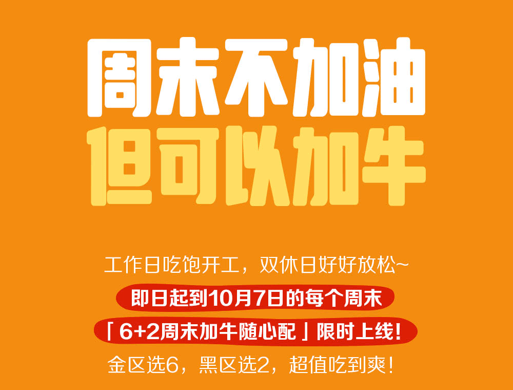 *周末加牛随心配“6+2=8件¥57.9”是指在活动期间每周六、日购买金区的6款指定产品搭配黑区任意2款指定产品,为57.9元。【金区】中产品可选:双层吉士汉堡、培根芝士双牛堡、飞碟鸡排堡、麦香鸡、酥酥多笋卷、薯条(小)、麦乐鸡(5块)、那么大鸡排、大玉米杯、派(可选香芋/菠萝)、麦麦趣鸡球,金区内同一产品不可重复选择。【黑区】中产品可选:迷你新地(可选草莓/朱古力)、中可口可乐、中无糖可口可乐、中雪碧、锡兰红茶、中杯怡泉+C、中杯阳光柠檬红茶。食品及包装以实物为准,图片仅供参考。上述产品自2024年8月26日起至2024年10月7日,仅在全国部分餐厅适用(不含港澳台地区餐厅,不含交通枢纽、服务区、旅游景区等特殊餐厅),具体以店内公示为准。活动渠道:仅限麦当劳App及麦当劳微信/支付宝小程序的到店取餐渠道、自助点餐机、餐厅柜台。以上组合仅限早餐时段后供应,早餐供应时间以餐厅实际为准,至上午10:30结束。通过麦乐送送餐服务、第三方外送平台、电商平台等渠道点餐的,优惠活动参与情况以各自渠道的图示宣传为准。除推广产品外,其他物品不在售卖范围。不与其他优惠同享。“Coca-Cola”、「可口可乐」、「雪碧」、[怡泉]、[阳光柠檬红茶]和弧形瓶是可口可乐公司的商标。“100%纯牛肉”是指牛肉饼的原料均为牛肉。