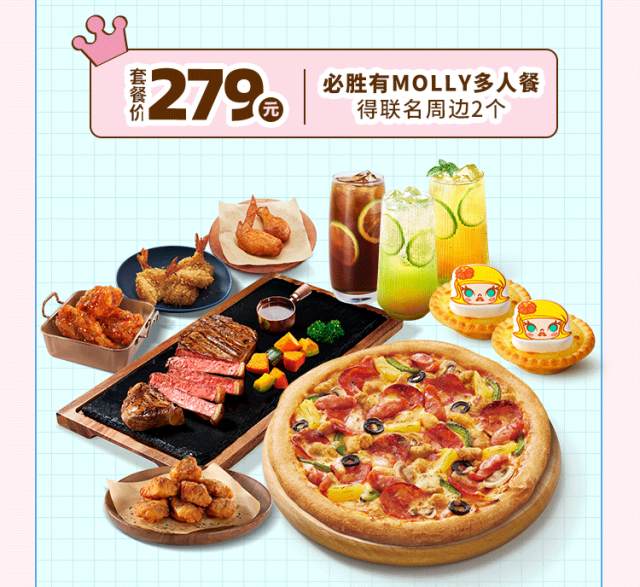 (1) 通过必胜客宅急送官方网络订餐渠道、堂食、自助点餐(扫码点餐+预点餐+外带自取)渠道,选购279元必胜有MOLLY多人餐1份,随餐得Molly主题系列实物周边*2个。(具体请以菜单实际显示为准)