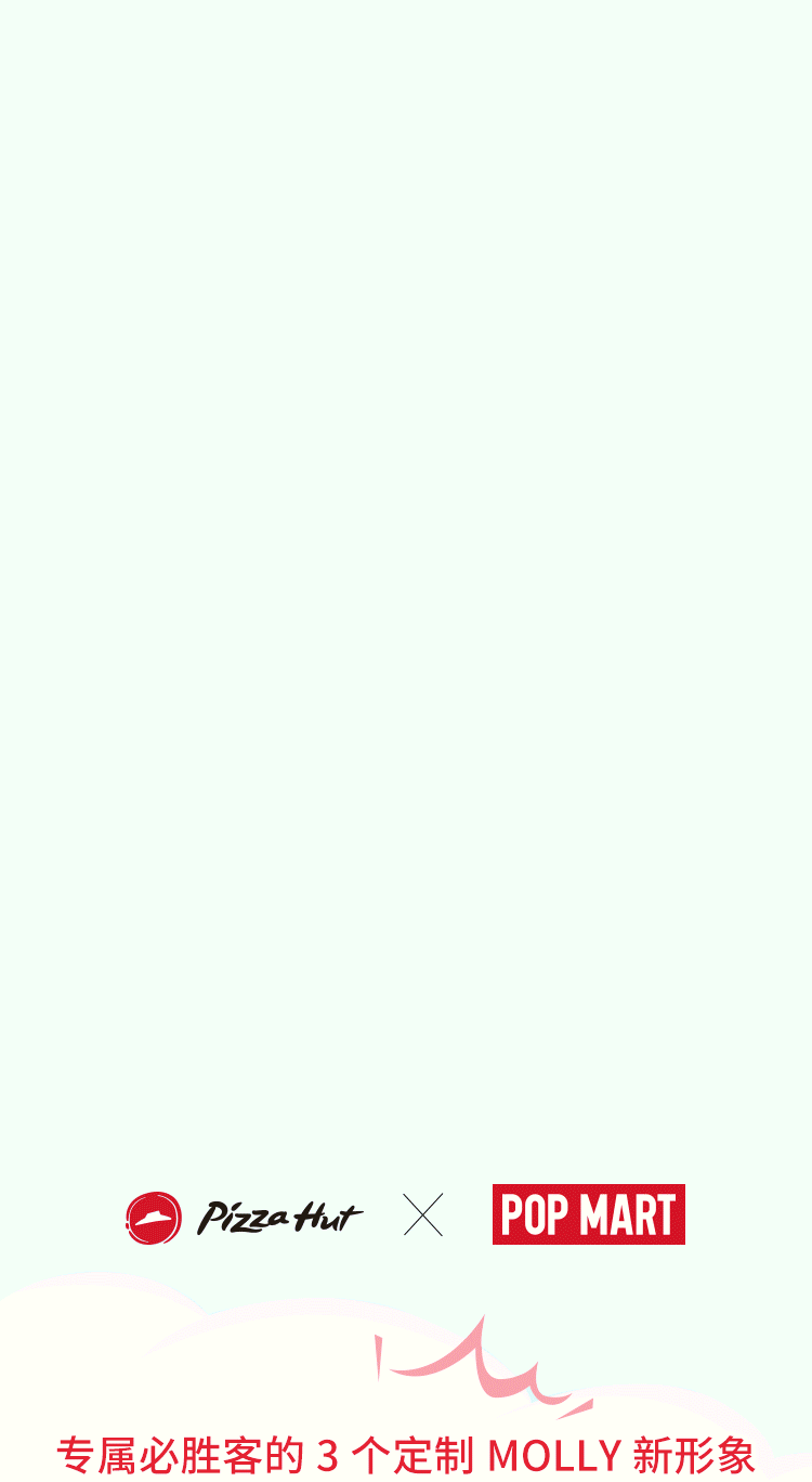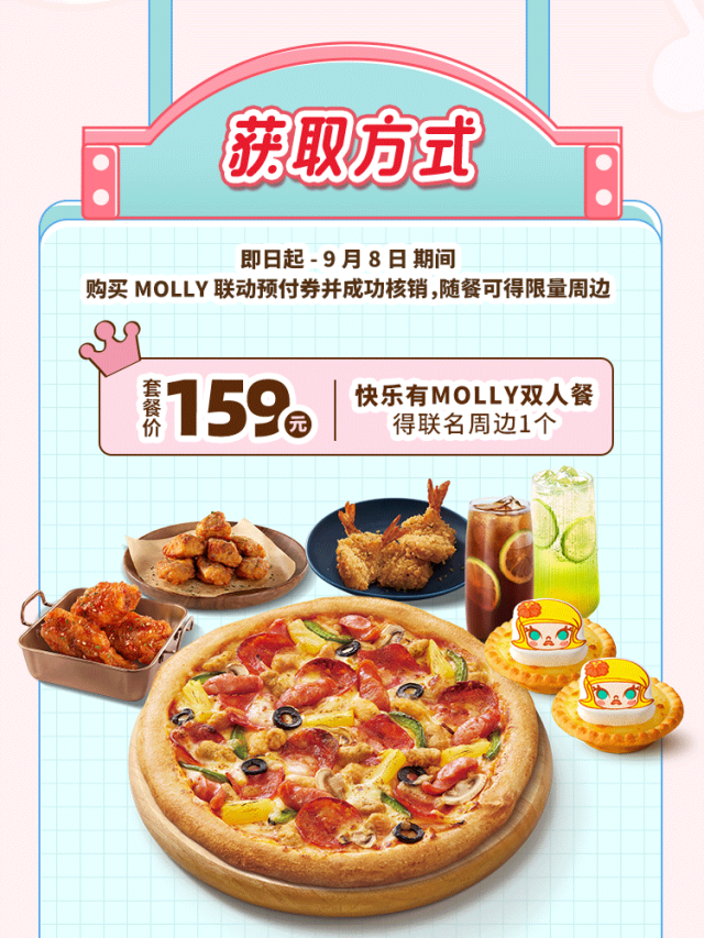 (2) 通过必胜客宅急送官方网络订餐渠道、堂食、自助点餐(扫码点餐+预点餐+外带自取)渠道选购159元快乐有MOLLY双人餐1份,随餐得Molly主题系列实物周边*1个。