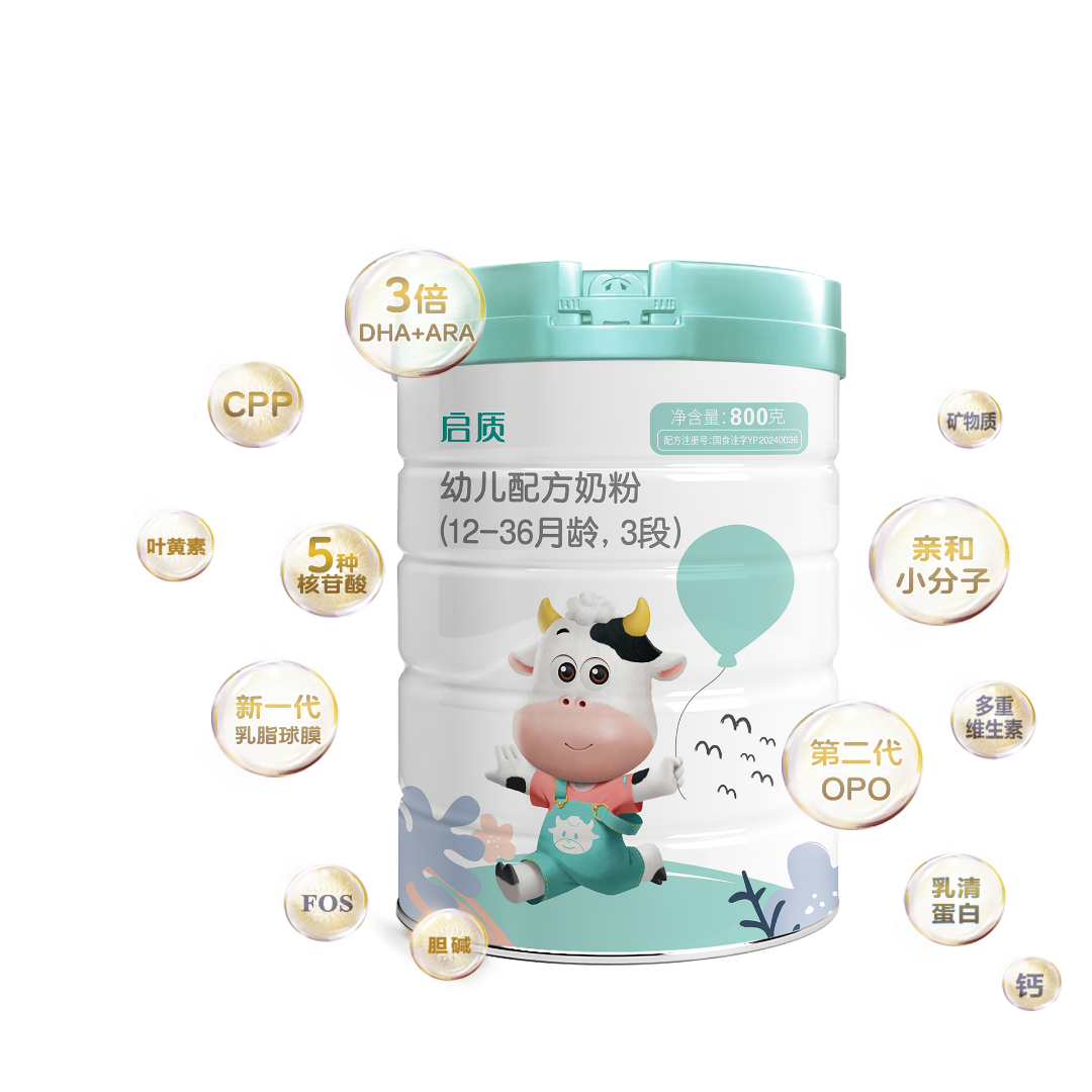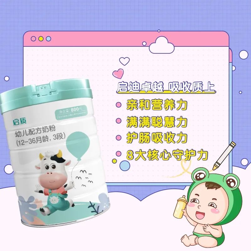 当然,也可以考虑更换配方奶粉,但是不建议在短时间内频繁更换。厌奶期宝宝有可能是因为不喜欢配方奶或者对口感味道出现抵抗。这个时候,我们可以尝试更换配方奶粉,比如主打亲和好吸收的圣元启质。