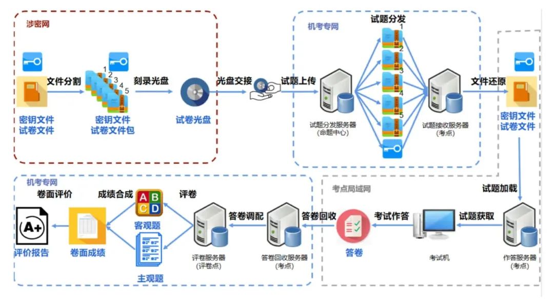 命题部门提供的试卷转换成教育部考试院制定的CQTI格式,加密后通过光盘的方式传递给考点,考点系统根据考务管理要求切分成多个片段后分次导入机考系统,尽最大程度保障试卷的安全性,防止泄密。