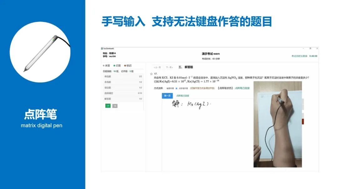 本次考试为考生提供了数码点阵笔。对于要求考生画图、输入复杂公式符号等无法使用键盘鼠标输入的题目,考生可以使用点阵笔手写输入。点阵笔采用USB接口即插即用,不改变考生手写习惯,无需提前培训。使用普通纸张,普通笔芯,耗材成本低廉。