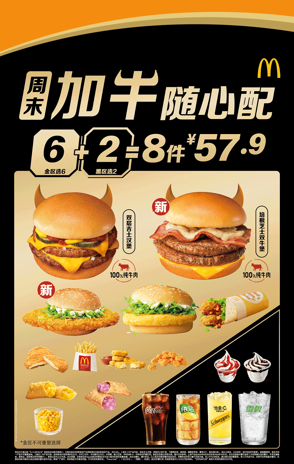 *周末加牛随心配“6+2=8件¥57.9”是指在活动期间每周六、日购买金区的6款指定产品搭配黑区任意2款指定产品,为57.9元。【金区】中产品可选:双层吉士汉堡、培根芝士双牛堡、飞碟鸡排堡、麦香鸡、酥酥多笋卷、薯条(小)、麦乐鸡(5块)、那么大鸡排、大玉米杯、派(可选香芋/菠萝)、麦麦趣鸡球,金区内同一产品不可重复选择。【黑区】中产品可选:迷你新地(可选草莓/朱古力)、中可口可乐、中无糖可口可乐、中雪碧、锡兰红茶、中杯怡泉+C、中杯阳光柠檬红茶。食品及包装以实物为准,图片仅供参考。上述产品自2024年8月26日起至2024年10月7日,仅在全国部分餐厅适用(不含港澳台地区餐厅,不含交通枢纽、服务区、旅游景区等特殊餐厅),具体以店内公示为准。活动渠道:仅限麦当劳App及麦当劳微信/支付宝小程序的到店取餐渠道、自助点餐机、餐厅柜台。以上组合仅限早餐时段后供应,早餐供应时间以餐厅实际为准,至上午10:30结束。通过麦乐送送餐服务、第三方外送平台、电商平台等渠道点餐的,优惠活动参与情况以各自渠道的图示宣传为准。除推广产品外,其他物品不在售卖范围。不与其他优惠同享。“Coca-Cola”、「可口可乐」、「雪碧」、[怡泉]、[阳光柠檬红茶]和弧形瓶是可口可乐公司的商标。“100%纯牛肉”是指牛肉饼的原料均为牛肉。