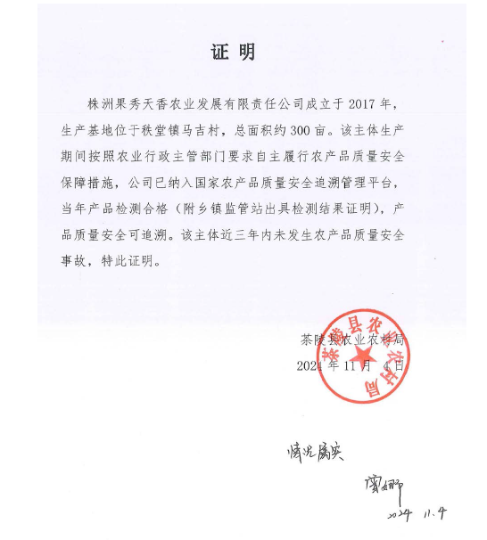 株洲果秀天香农业发展有限责任公司座落在茶陵县秩堂镇马吉村吉川花坝岭流转荒山,共计600余亩,是一家水果、蔬菜种植、加工、营销、观光、民宿旅游为一体的产业化企业。在马吉村村支两委领导下,大力发展乡村振兴项目,共带动临时就业100余人,为当地村民增加收入约2万元/户。同时为加盟农户提供所需生产资料开展技术培训、技术交流和咨询服务等,从土地流转以来,已投入基金288万,每年为本地提供临时就业岗位2500个左右,为村民年收入增收16万左右,该公司科学种植合理使用肥料农药等,未造成环境污染。