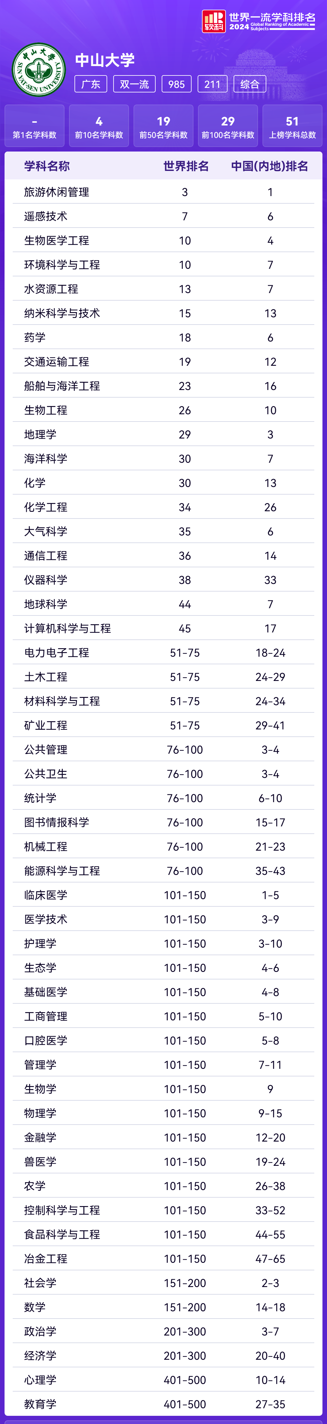 中大共有51个学科上榜,其中旅游休闲管理位列中国(内地)第1名,王牌专业临床医学位列中国(内地)1-5名。