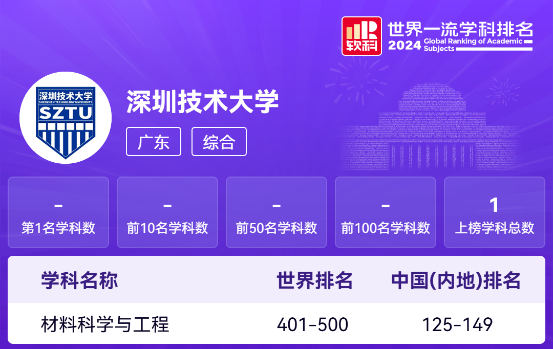 深技大共有1个学科上榜,为材料科学与工程,位列中国(内地)125-149名。