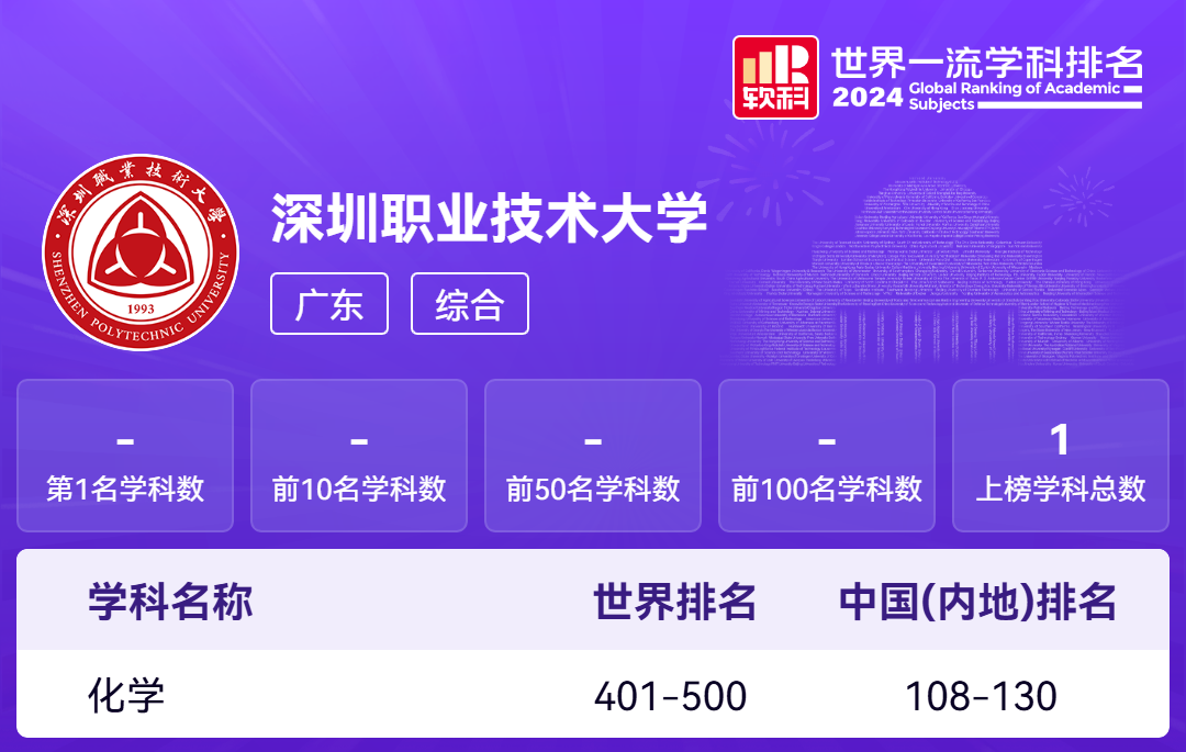 深职大共有1个学科上榜,为化学,位列中国(内地)108-130名。