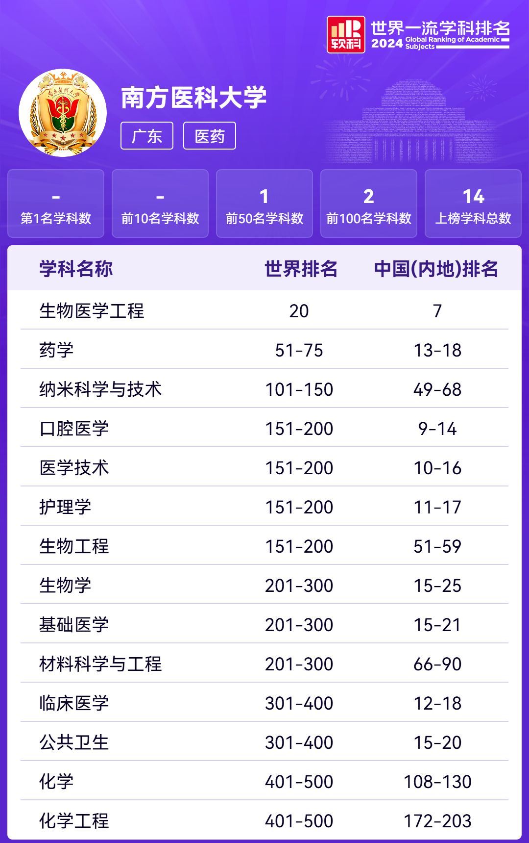 南医大共有13个学科上榜,其中生物医学工程位列中国(内地)第7名,教育学位列中国(内地)6-15名。