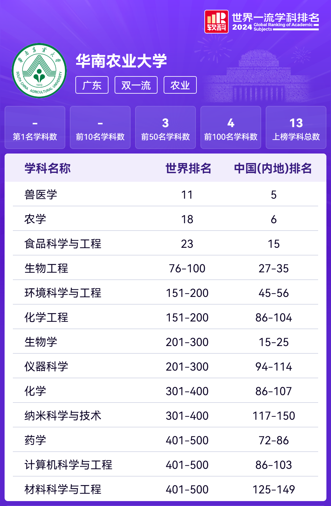 华农共有13个学科上榜,其中兽医学位列中国(内地)第5名,农学位列中国(内地)第6名。