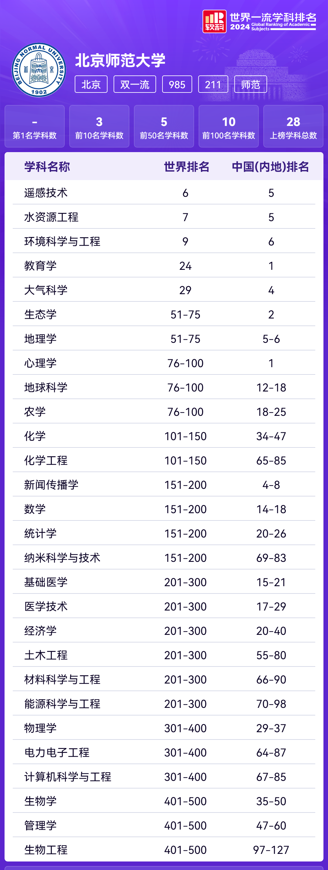 软科未对分校区进行单独排名,我们可以参考北师大的整体排名情况,其中王牌专业教育学、心理学位列中国(内地)第1名,共有28个学科上榜。