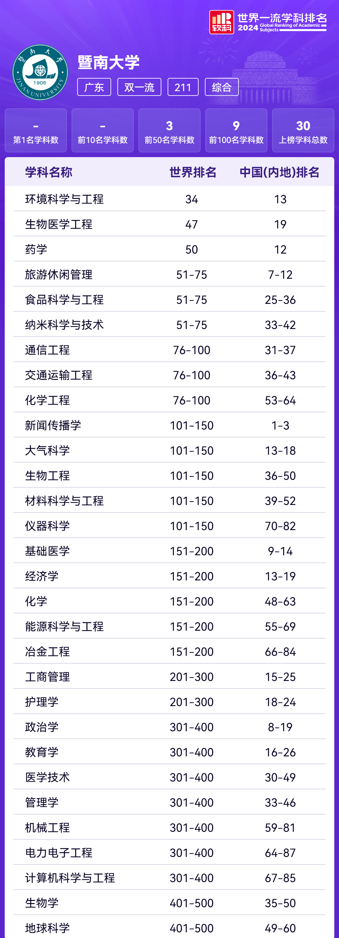 暨大共有30个学科上榜,其中药学位列中国(内地)7-12名,新闻传播学位列中国(内地)1-3名。