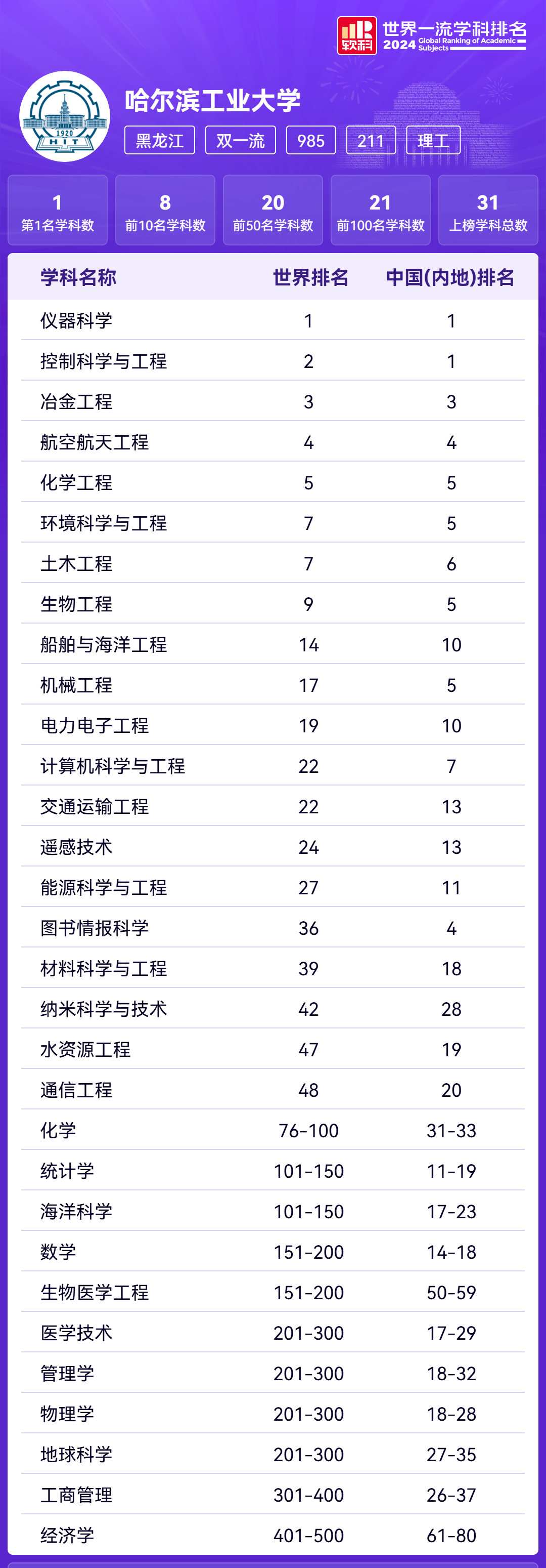 软科未对分校区进行单独排名,我们可以参考哈工大的整体排名情况,其中仪器科学位列世界第1名,控制科学与工程位列中国(内地)第1名,共有31个学科上榜。