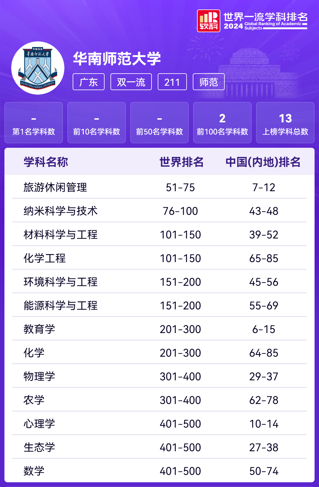 华师共有13个学科上榜,其中旅游休闲管理位列中国(内地)7-12名,教育学位列中国(内地)6-15名。