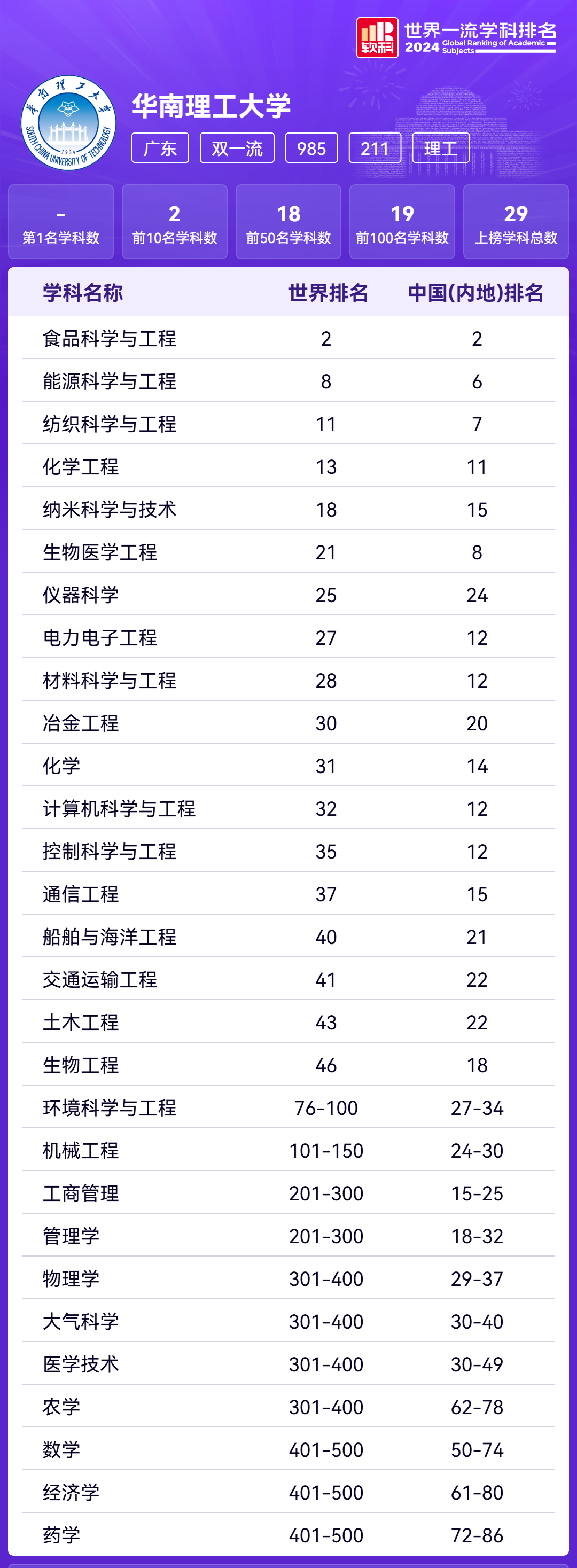华工共有29个学科上榜,其中食品科学与工程位列中国(内地)第2名。