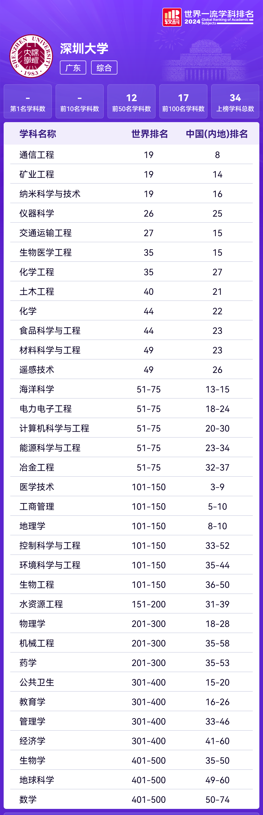 深大共有34个学科上榜,其中通信工程位列中国(内地)第8名,医学技术位列中国(内地)3-9名。