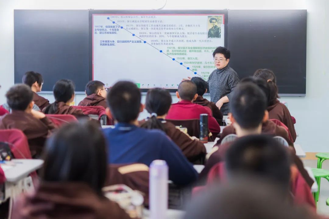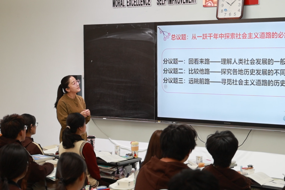“民族一步跨千年,跨越的是生产力还是生产关系?”“保尔的生活经历和苏俄社会发展的不同阶段有怎样的联系?”“家里养过猫的同学,应该对这道题深有感悟。因为猫有两个爱好,一个喜欢往下推东西,一个喜欢使劲扯住重物”……一间间核心问题与生动生活交织的初中、高中常态化课堂,此时此刻有了不同的意义,在同学们通过“核心问题”“自悟单”“议学任务”“小组讨论讲解”专注吸纳知识的同时,前来听课的教师们也在聚精会神的学习,捕捉着课堂中的每一个细节,笔记本上细细密密的文字,记录着听课过程中汲取的“技能”、迸发的灵感,以及不同学段课堂教学的异同与困惑。