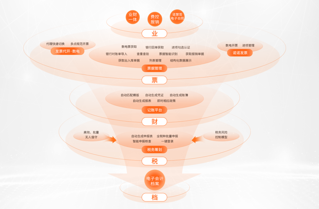 诺诺网作为九部委认可的“电子凭证会计数据标准深化试点平台”的提供方,积极运用数字技术优势与成熟的产品方案,搭建了的覆盖企业内部开票、报销、入账、归档流程的一体化企业无纸化平台。平台在功能应用与服务模式上完全满足《软件规范》的各项要求,适应电子凭证会计数据标准,提供智能记账、云端开票、智慧报税、电子凭证归档、运营管理等财务应用与功能,满足会计无纸化、数字化的全部要求;帮助企业推进财务数智化进程,完成标准化的财务数据体系、全面智能的财务数据分析、高效合规的财务处理,建成自动化、智能化的会计信息系统。