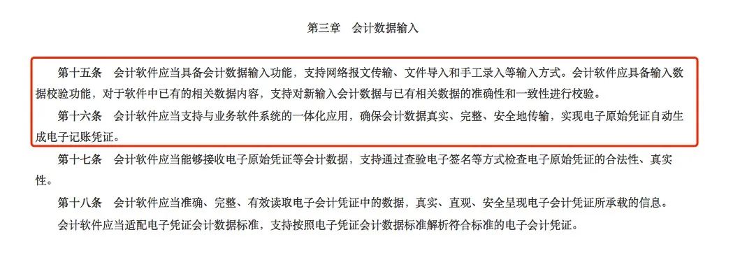 规范中强调了会计数据本身与产生会计数据的电子原始凭证或业务软件数据需要会计软件提供数据的关联性,准确性和一致性的保障。在会计信息系统输入环节,明确了电子凭证在对电子票据等原始凭证的接收的数据校验、查验的基本要求;此外,应支持与业务软件系统的一体化应用的需求,规范了企业业财融合的拓展方向,能够形成业财一体化的应用模式,由电子原始凭证自动记账,建立业务与财务数据的关联性,提升企业管理效率,为准确的经营决策提供会计数据保障。
