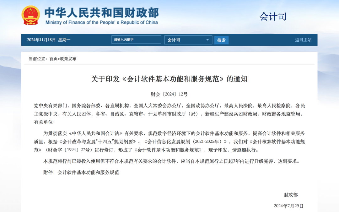 为贯彻落实新会计法,继续深化推广电子凭证会计数据标准试点工作,财务部于7月修订印发了《会计软件基本功能和服务规范》(财会〔2024〕12号,以下简称《软件规范》)的通知。自2025年1月1日起施行。