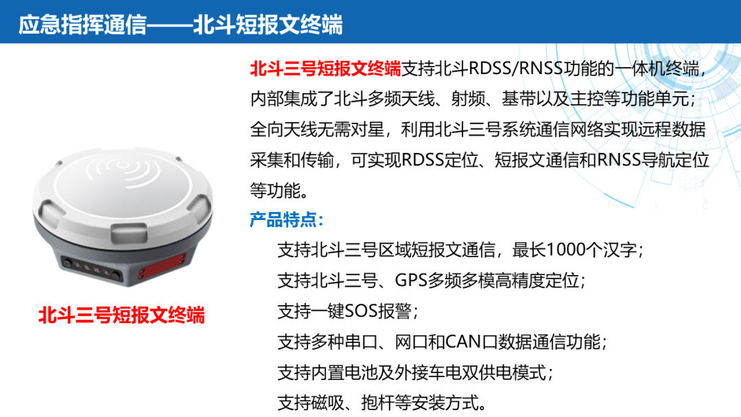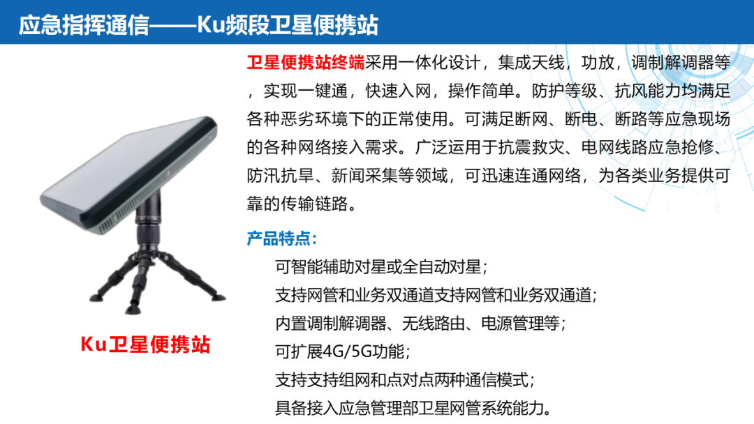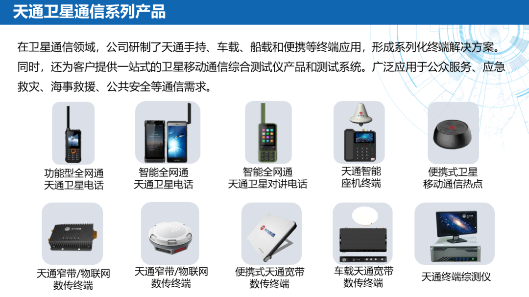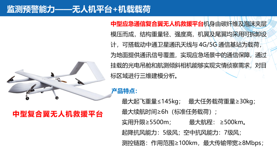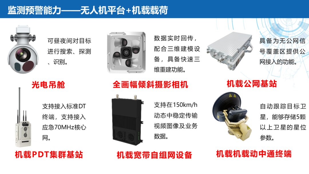 ——应急通信:北斗终端(北斗三号手持机)、卫星电话融合终端(手持户外天通卫星电话、天通多功能室内外座机)、北斗替代(软件/模块/整机)、Ku频段卫星便携站、145公斤级应急通信复合翼无人机及机载通信产品(公网基站、PDT集群基站、宽带自组网设备、机载动中通终端)。