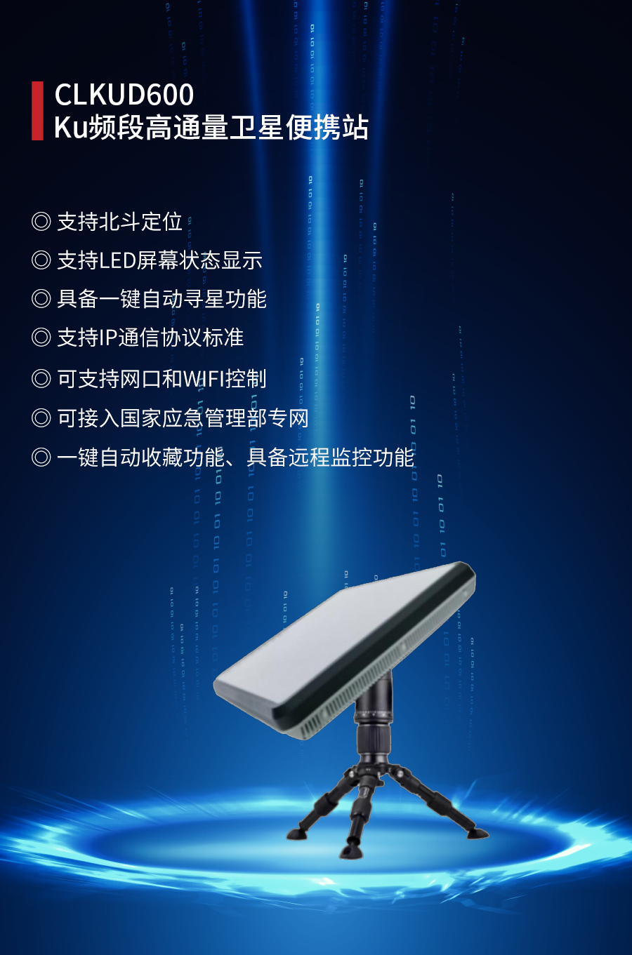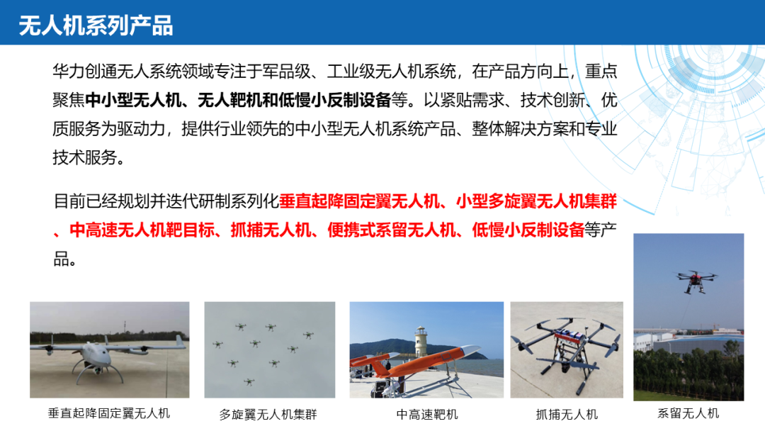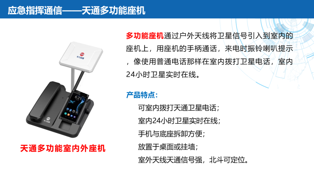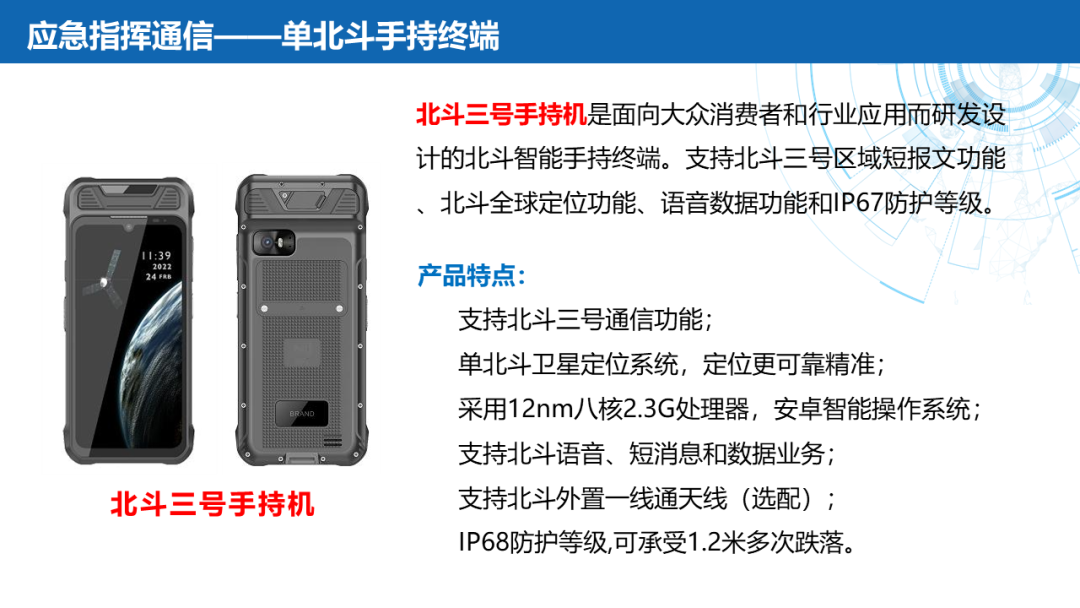 ——应急通信:北斗终端(北斗三号手持机)、卫星电话融合终端(手持户外天通卫星电话、天通多功能室内外座机)、北斗替代(软件/模块/整机)、Ku频段卫星便携站、145公斤级应急通信复合翼无人机及机载通信产品(公网基站、PDT集群基站、宽带自组网设备、机载动中通终端)。