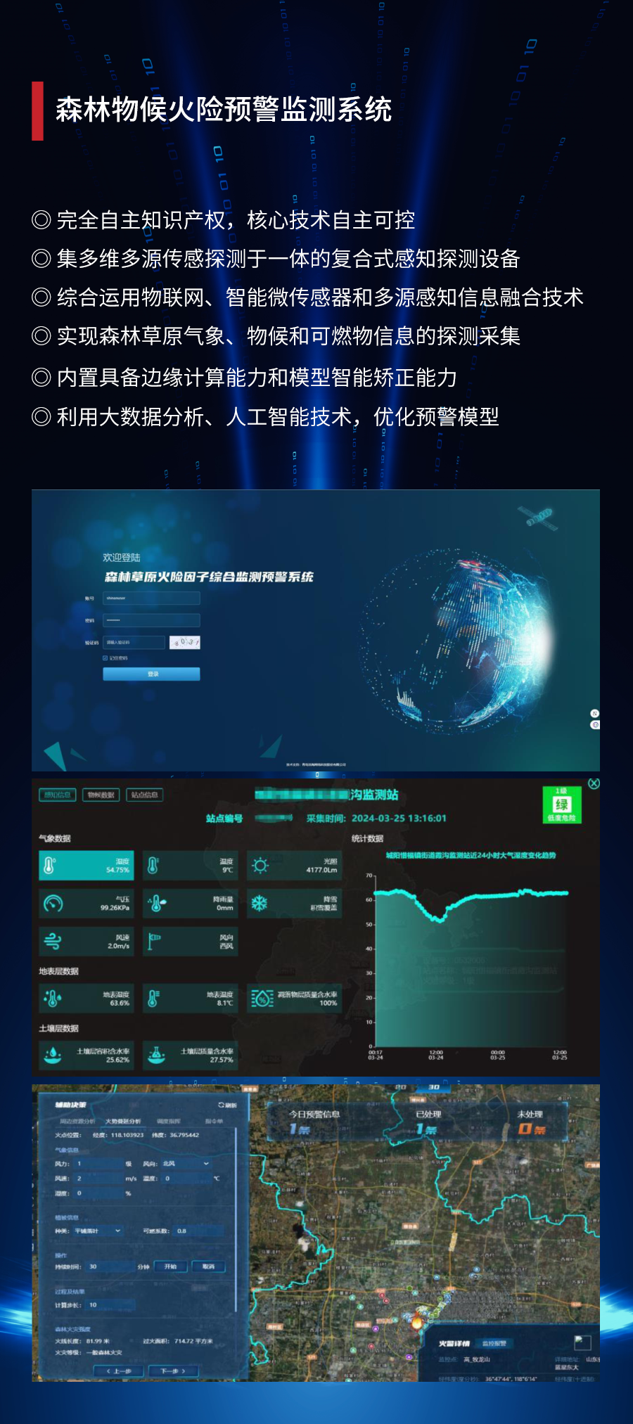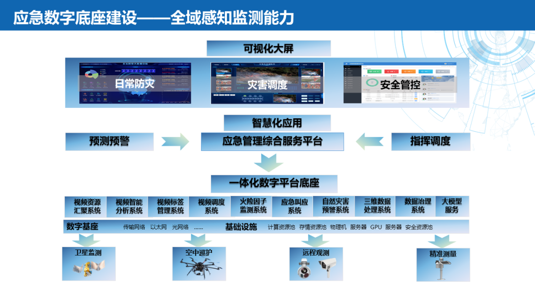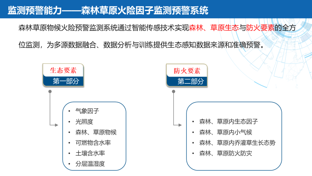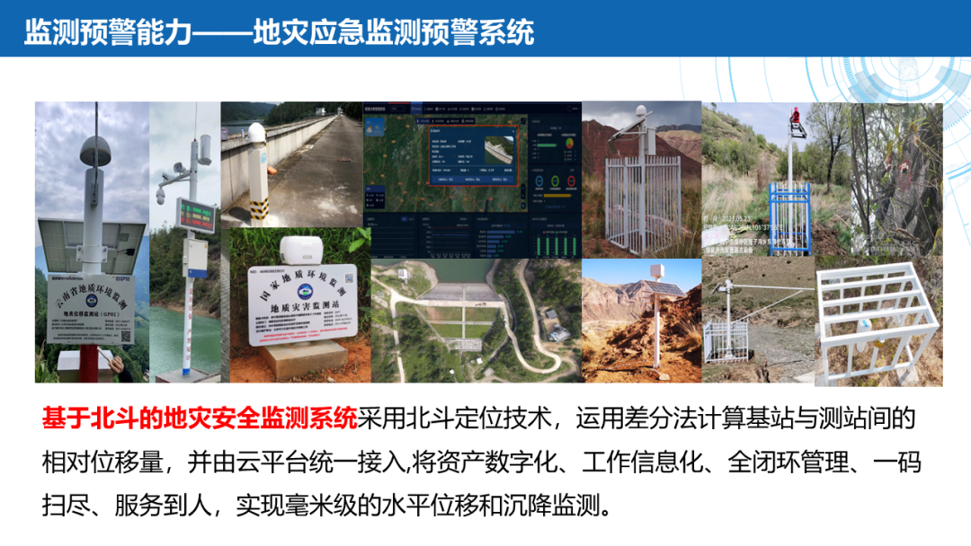 ——监测预警:空中巡视设备巢巡测点、森林草原火险因子综合监测站(基于北斗的地灾/火灾安全监测系统)、北斗融合网关、应急监测各系统融合平台升级。