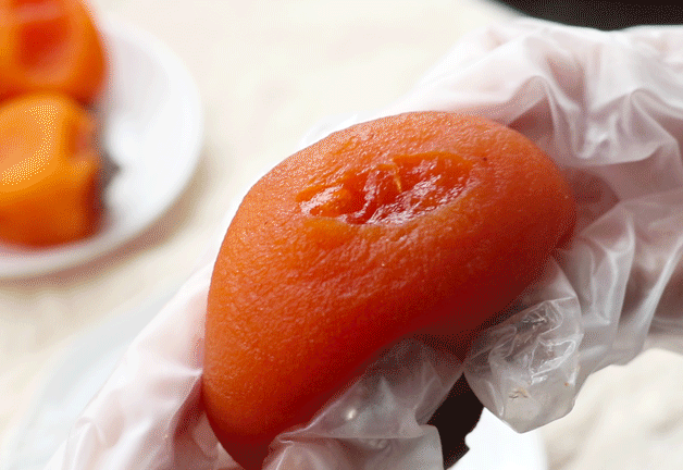 不用传统干柿饼,流心冰柿是烘烤出的半干柿饼,比鲜柿子甜,比柿饼糯,是流动的蜜糖。