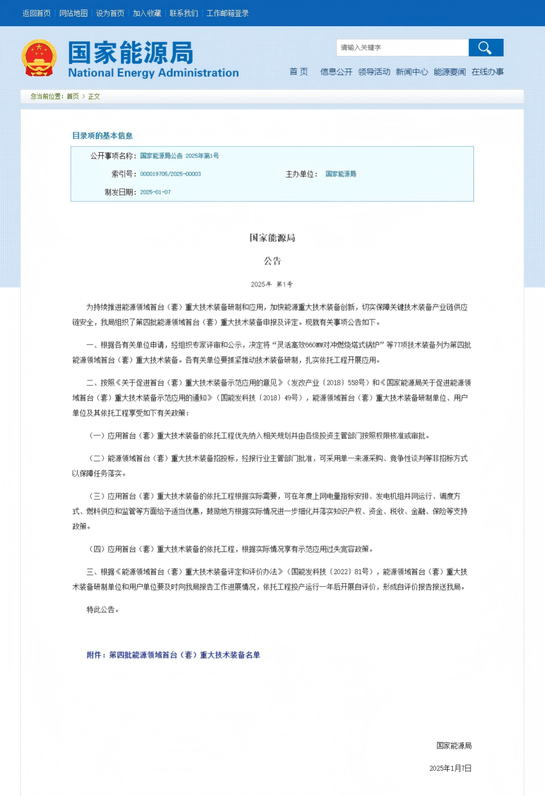 据国家能源局网站1月13日消息,为持续推进能源领域首台(套)重大技术装备研制和应用,加快能源重大技术装备创新,切实保障关键技术装备产业链供应链安全,国家能源局组织了第四批能源领域首台(套)重大技术装备申报及评定。经组织专家评审和公示,国家能源局2025年第1号公告正式发布第四批能源领域首台(套)重大技术装备名单。