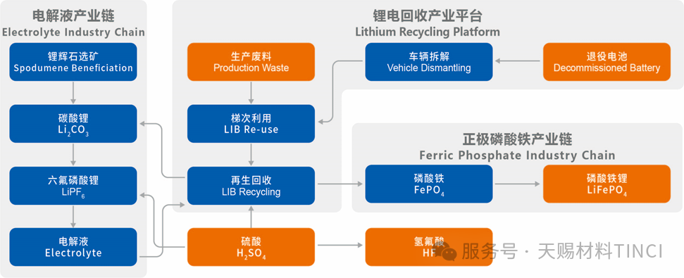 天赐材料打造了循环经济模型。公司的循环模型分为内循环和外循环:内循环达成了氟、硫、氯元素的回收与减排;外循环实现了锂、铁、磷等元素的再生及利用。