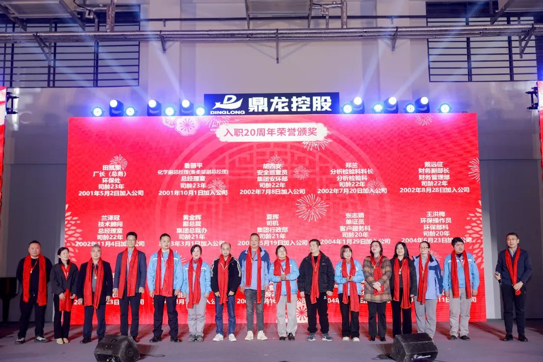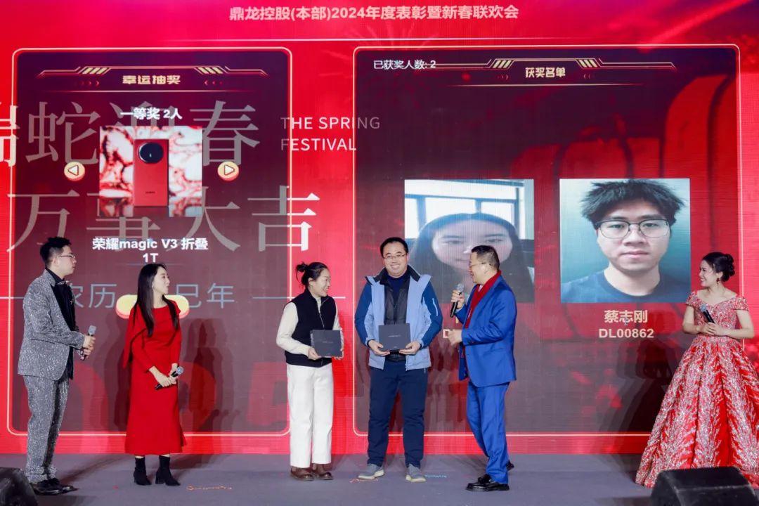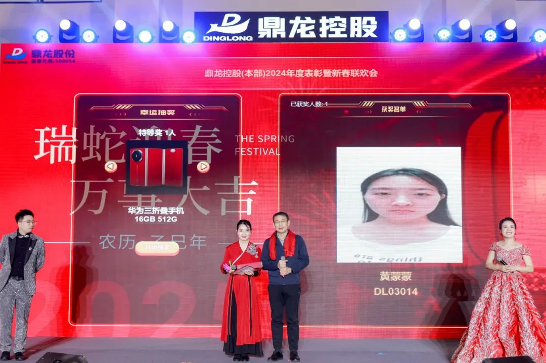 颁奖环节结束后,精彩绝伦的表演接踵而至,充分展现了大家丰富的才艺,使得现场氛围愈发热烈。朱顺全总裁携湖北省京剧院主力琴师霍路芳及其团队带来了京剧名曲《迎春曲》、《坐寨》,集团工会主席倾情献唱《穆桂英挂帅》,一展国粹魅力。一首《驿动的心》,把大家的思绪带入过去一年差旅奔波,回忆都化作了此刻对拼搏岁月的深深感慨。由著名旅美青年钢琴演奏家郭晓宇、著名小提琴演奏家夏佳佳、著名歌唱家冯丽媛带来的钢琴、小提琴协奏《春节序曲》,钢琴独奏《肖邦 C 小调》,以及民歌清唱等节目让大家沉浸在音乐的海洋中。一首喜庆热闹的粤语歌《祝福你》,为大家带来了美好祝福。一首温情的《相亲相爱一家人》,让大家感受到团队协作的美好情谊。《我爱你中国》、《中国人》等合唱节目,更是唱出了鼎龙人对祖国的热爱、对公司的祝福。开门红奖、幸运奖、三等奖、二等奖、一等奖、特等奖,一轮又一轮的抽奖,让现场的气氛一次次达到高潮。朱双全董事长为参会员工抽出了晚会特等奖,华为三折叠手机。来到了整场含金量最高的环节,“一路同行,感恩有你”,朱双全董事长亲自为入职 20 年的员工们颁发了纯金奖牌感谢了这份长情的陪伴。最后,朱双全董事长、朱顺全总裁携所有高管上场合唱《明天会更好》,为这场盛会画上了一个圆满的句号。相信在全体鼎龙人的共同努力下,我们一定能够创造更加辉煌的明天。