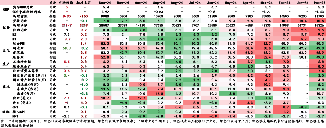 12月当月来看,需求方面,社零同比增速小幅回升,以旧换新政策仍有支撑,当前消费对政策依赖度较高、内生动力偏弱;固定资产投资同比回落至低位,随着专项债发行步入尾声,基建投资绝对增速小幅回落,制造业投资呈现较强韧性,而地产同比增速仍有下行惯性;出口同比增速超预期回升,抢出口因素已经开始体现。生产方面,工业生产表现超预期回升,主要受抢出口的带动,产销率超季节性回升,预计名义产成品存货继续去库。价格方面,CPI仍弱、PPI同比小幅回升,物价偏弱状态尚未实质改变。