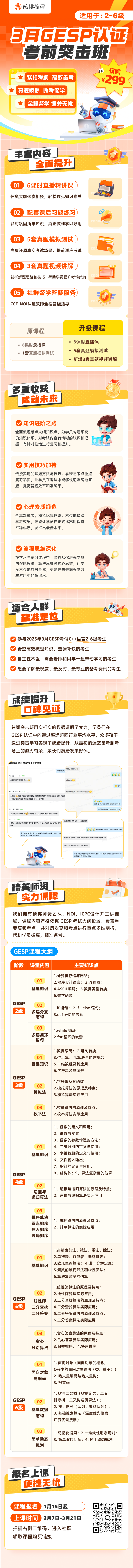 为了助力学员在GESP考试中取得优异成绩、全方位提升竞争力,核桃编程精心推出 2025 年 3 月 GESP 等级认证考前突击班!此次突击班覆盖2级—6级课程,内容全面升级!