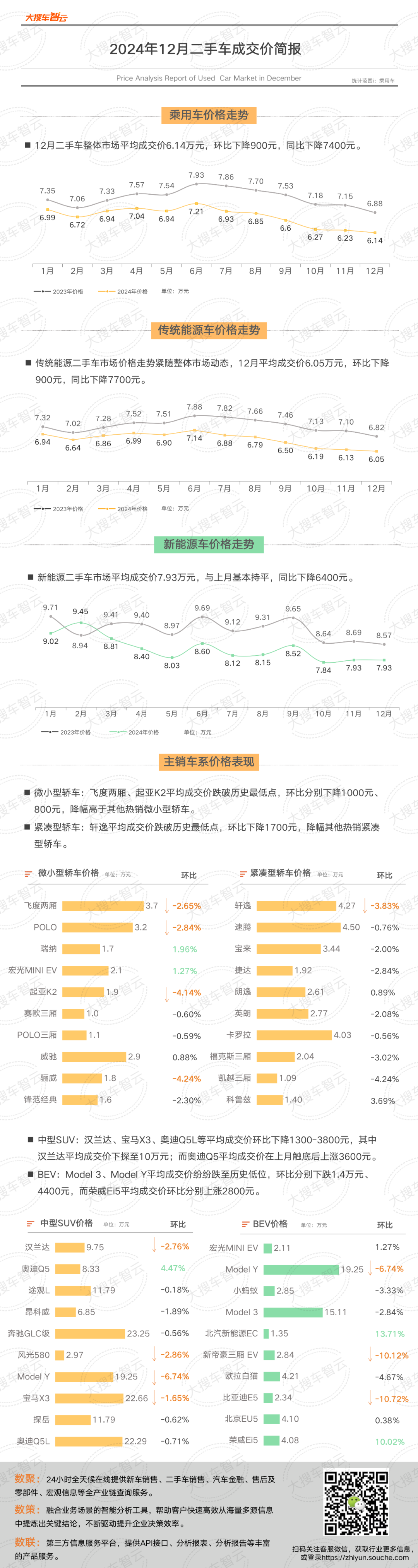 1. 二手车整体市场平均成交价6.14万元,同比下降7400元。2. 轩逸、飞度两厢、本田CR-V等平均成交价跌破历史最低点,环比下降1000-1700元。3. 奥迪A4L、宝马3系、奔驰C级平均成交价环比下降1300-2300元。4. 奥迪Q5平均成交价在上月触底后本月上涨3600元。