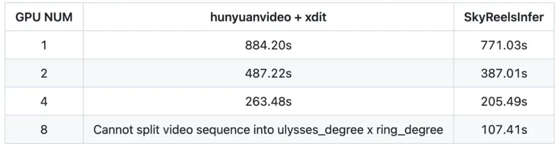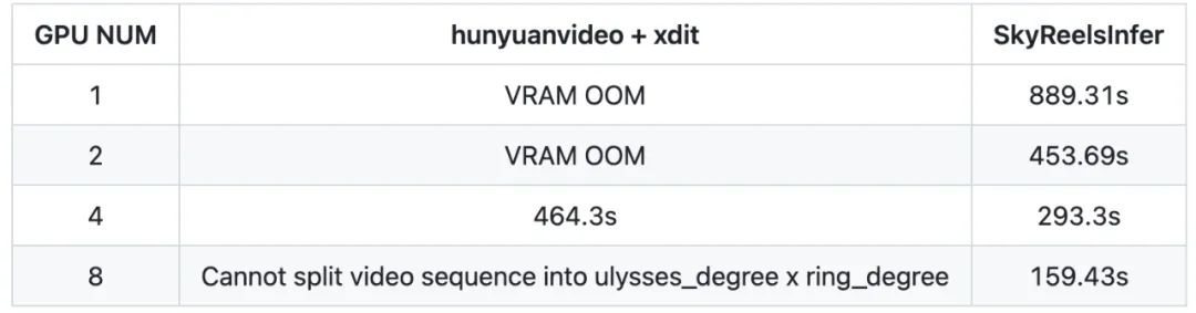 图3丨推理生成544p视频,SkyReels-Infer版本具备更鲁棒的多卡部署策略,支持8卡部署