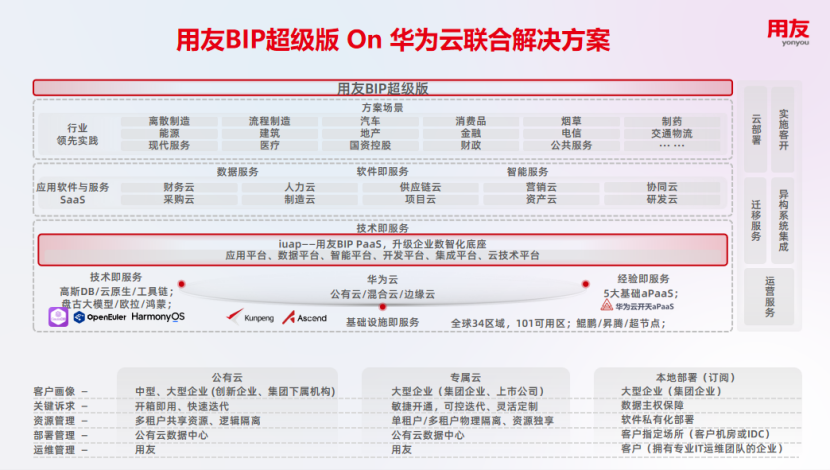 方案以用友BIP超级版技术架构为核心,融合华为云全球基础设施优势,打造“云原生+AI驱动”的全栈技术体系,为企业上云赋智提供坚实支撑。