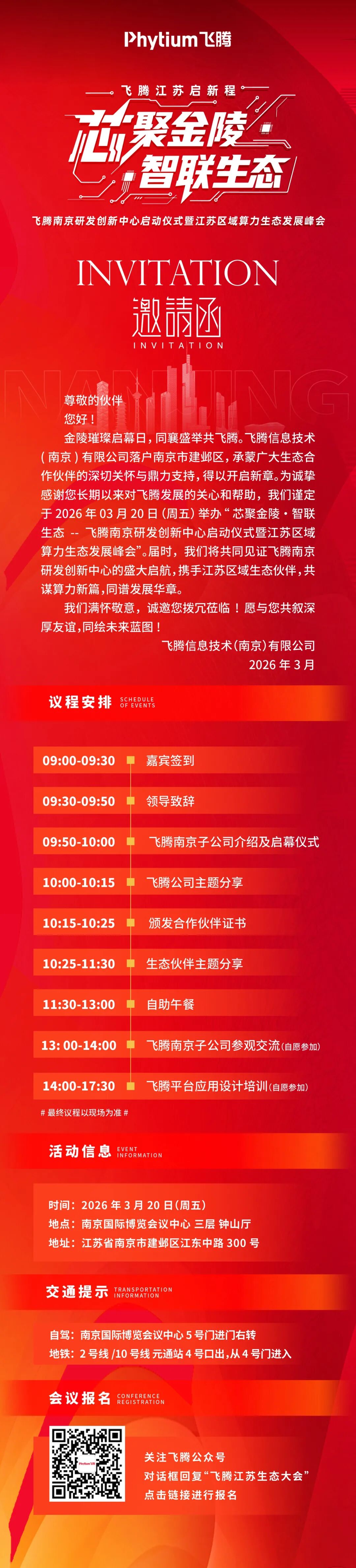 金陵春潮涌,算力生态兴!飞腾信息技术(南京)有限公司正式落户建邺区,飞腾南京研发创新中心启动仪式与江苏区域算力生态发展峰会即将启幕!这不仅是一场 “落子南京、链接生态” 的里程碑事件,更是一次与伙伴共探算力未来、共享技术红利的机遇之约。3月...